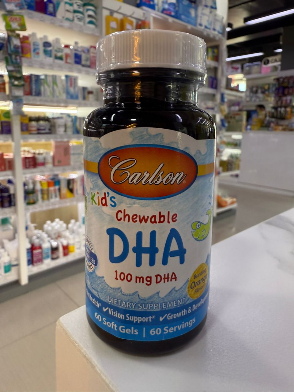 Carlson Kid’s Chewable DHA. Suplemento dietético de 100 mg de DHA en cápsulas blandas masticables. El DHA es un ácido graso esencial OMEGA-3 que apoya la salud cerebral, la visión y el crecimiento y desarrollo en niños. Cápsulas blandas con delicioso sabor a naranja (Bursting Orange Flavor). Contiene 60 porciones.